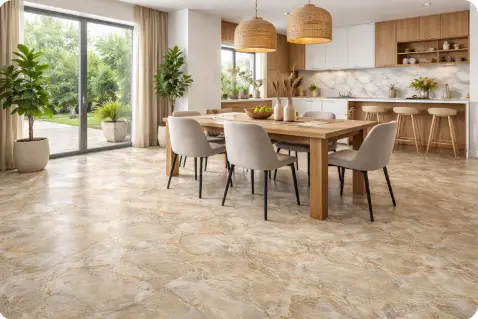 Cerámico Barcelos Beige 46×46 cm, de acabado brillante y superficie lisa, con diseño marmolado en tonos cálidos que aporta elegancia y amplitud, ideal para realzar ambientes clásicos y contemporáneos.